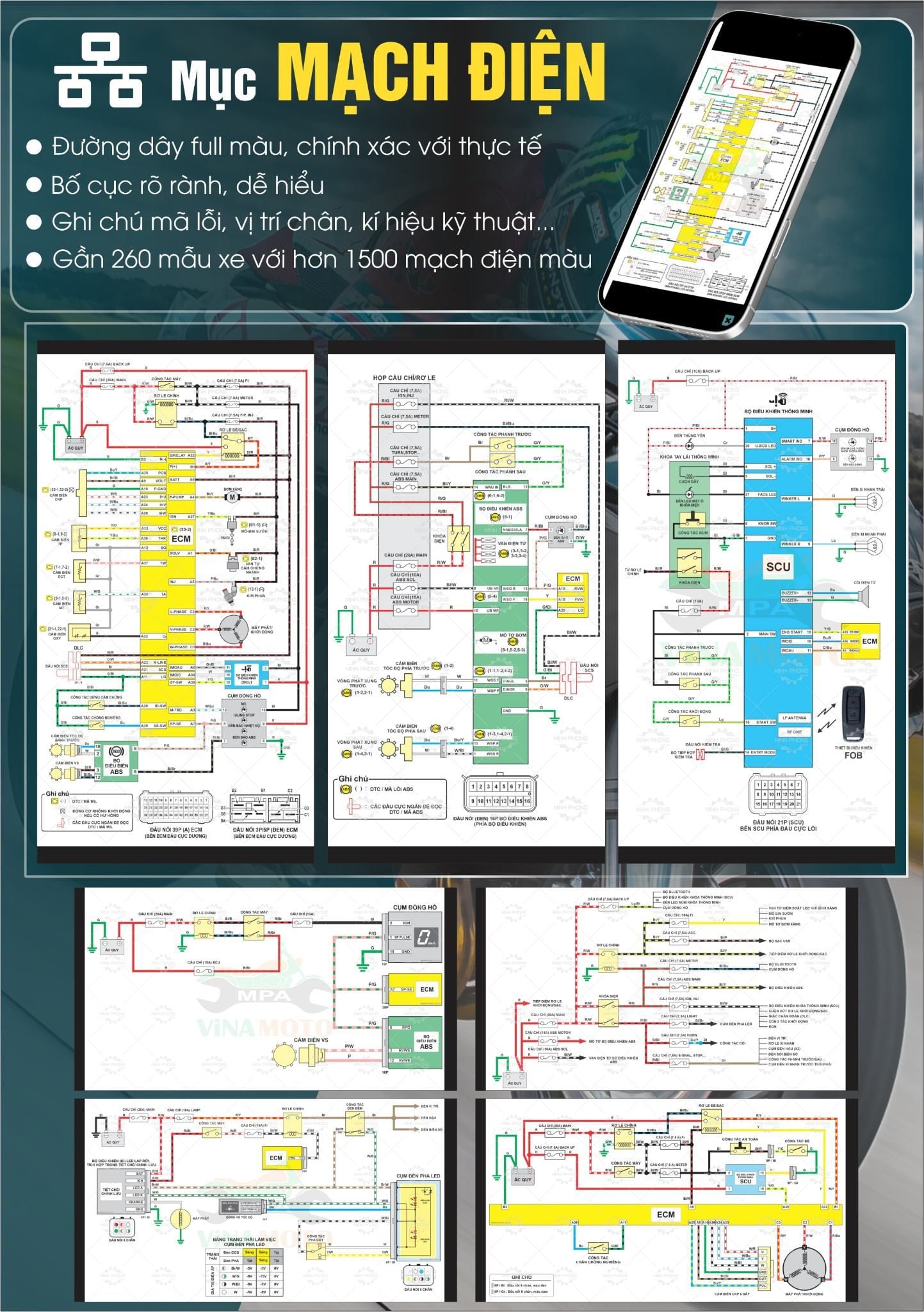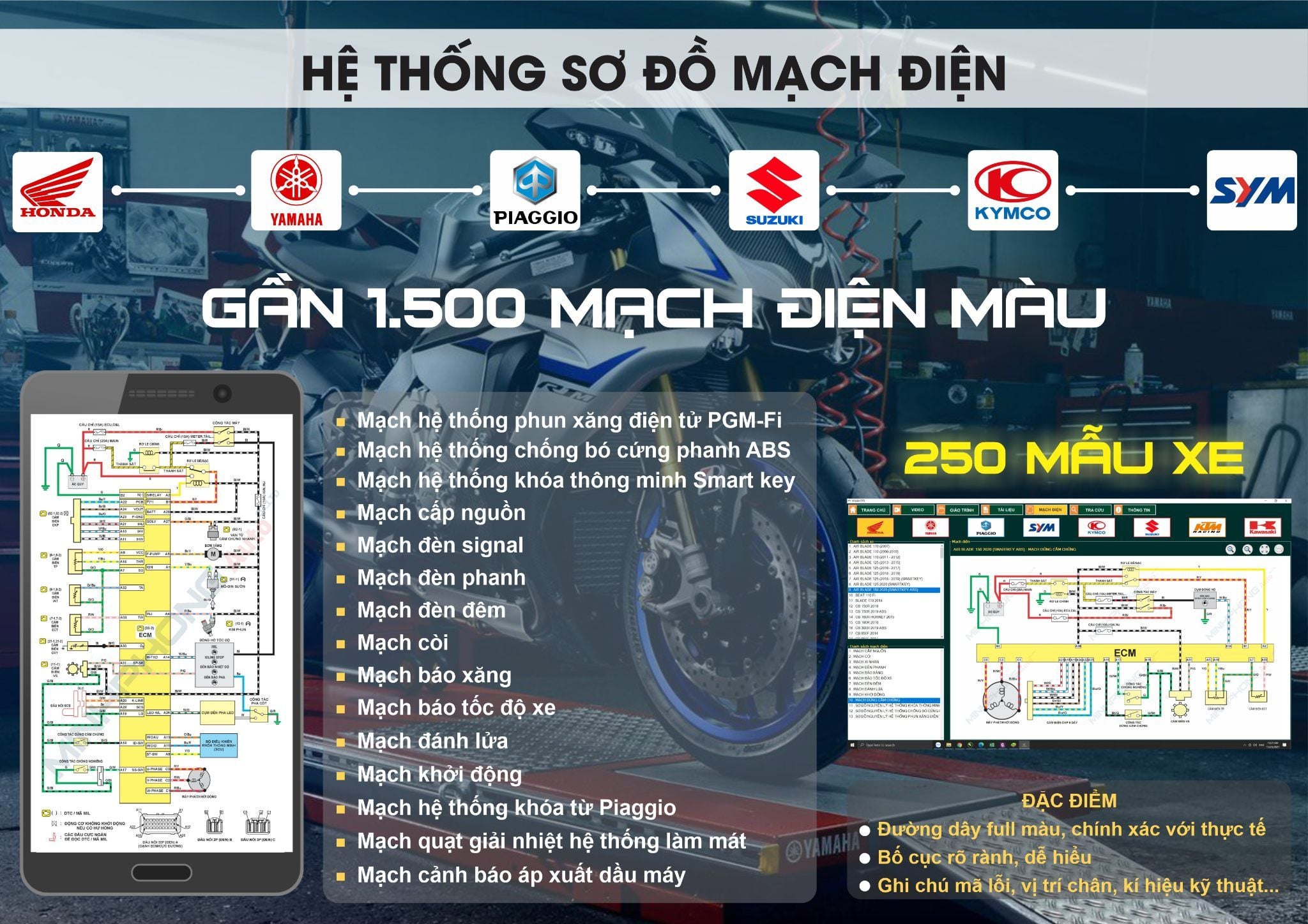 Bao gồm cả xe số, xe tay ga, xe côn tay và các mẫu xe đời mới có hệ thống điện tử hiện đại như FI, ABS,...