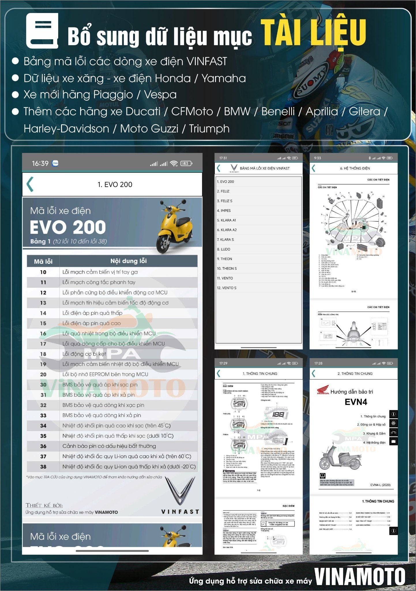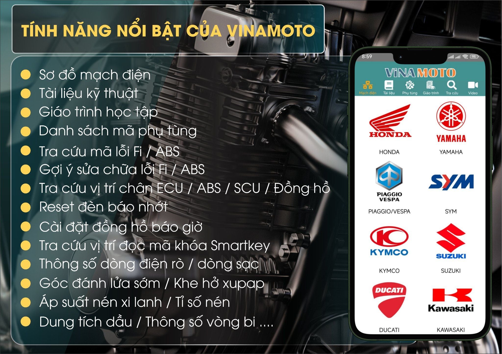 Tài liệu kỹ thuật được ViNAMOTO liên tục bổ sung và cập nhật, đặc biệt là đối với các mẫu xe mới ra mắt có công nghệ hiện đại (phun xăng điện tử, hệ thống smart key, ABS...).