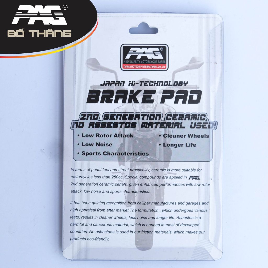 - An toàn: Sử dụng lực bàn đạp ít, độ ma sát ổn định ngay cả khi phanh gấp ở vận tốc cao. Khi hệ thống phanh bị ẩm ướt hay bám bụi thì hệ số ma sát của bố thắng đĩa (phanh đĩa) PAG vẫn rất tốt.
